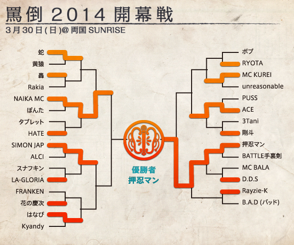 今大会は下町らしく喜怒哀楽がある人情深いイベントだった。トラブルさえもイベントに昇華させる懐の深さ。全MCに大きなリスペクトを。そしてG.O&はなび,両氏には仲間の結束力を教えて貰えた。二人には特に大きな感謝を。罵倒。2014も要注目!!(筆者:吉田 圭文)